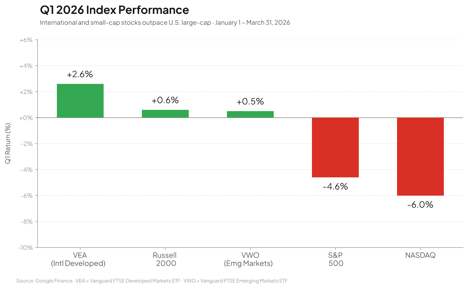 The war in Iran derailed this momentum — but overall, diversification still paid off meaningfully in Q1. The S&P 500 ended the quarter down roughly 4.5% while small and mid-cap stocks and major international indices ended the quarter in the green.