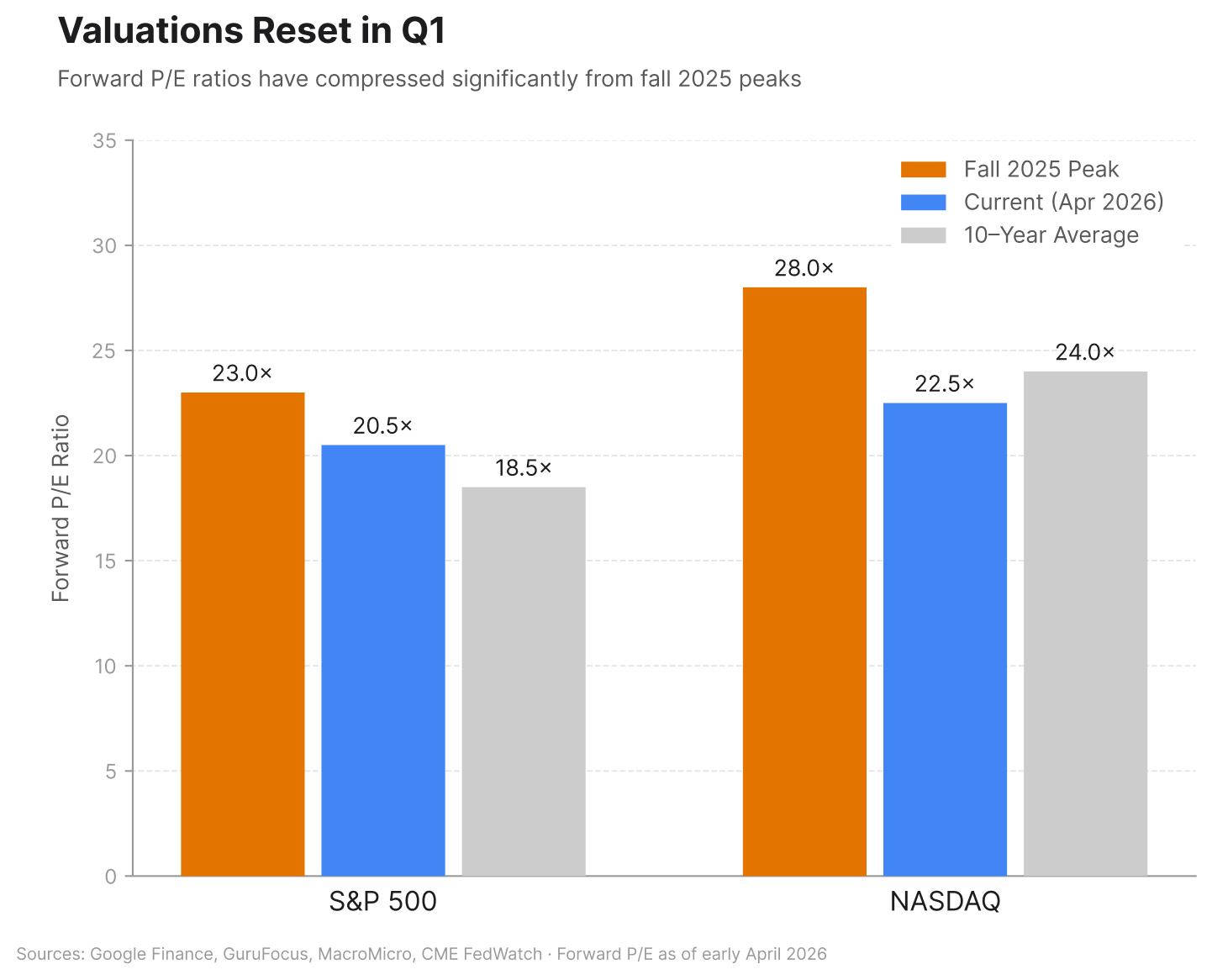 Valuations, meanwhile, have already reset lower. The S&P 500's forward P/E, the price investors are paying for future earnings, has declined to roughly 20x from 23x last fall. The compression in the tech sector has been even more pronounced. The tech-heavy Nasdaq index is now trading at 23x forward P/E, down roughly 20% from last fall’s peak and now below the 10-year average of nearly 24x. In terms of valuation, we have a much better entry point for equities today than we did in January.