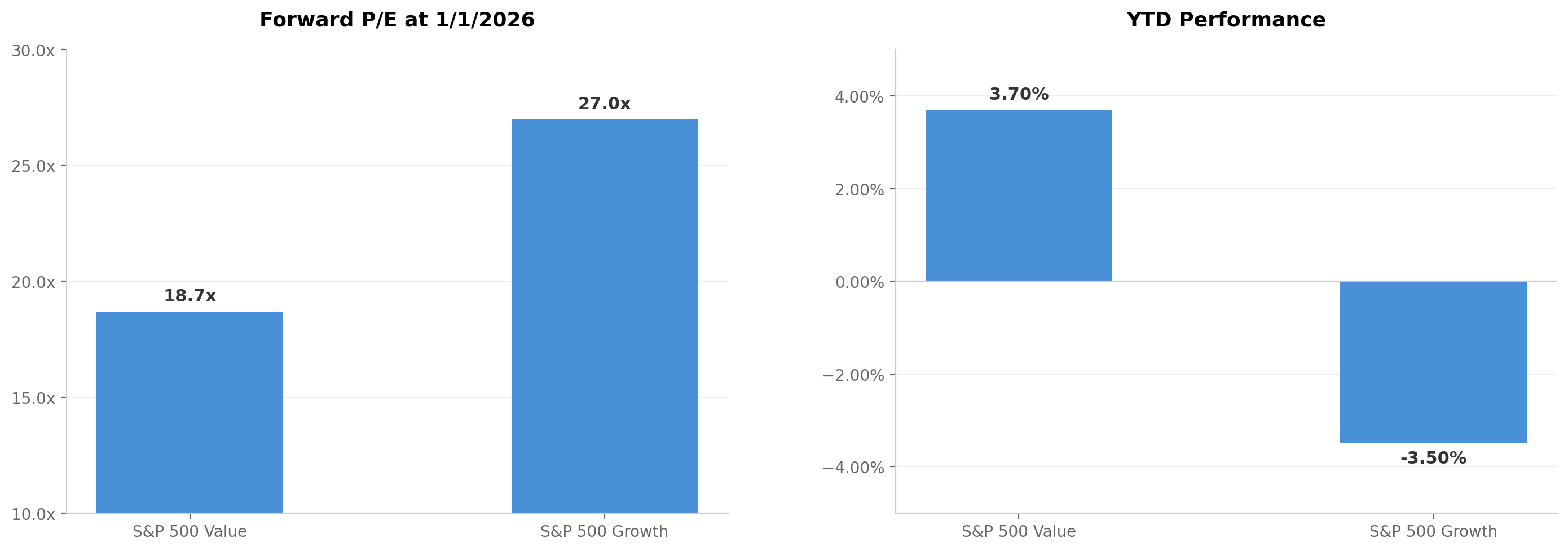 The S&P 500 Value Index, which traded at ~19x forward P/E at the beginning of the year, is up about 3.3% year-to-date. The more expensive S&P 500 Growth Index, which traded at 27x to start the year, is down roughly 3%. That’s a 6-point gap in six weeks — a significant reversal from growth’s dominance over the past several years.